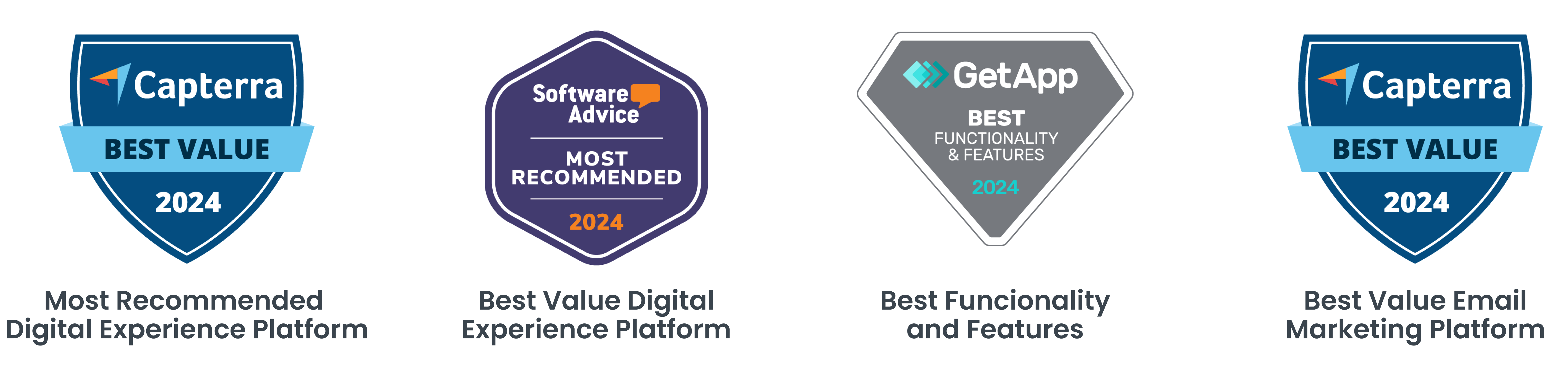 En 2024, fortalecimos nuestra conexión con cada cliente y partner que confía en nosotros. La increíble participación en nuestro primer Workflow Challenge y los badges recibidos en Capterra, como “Most Recommended Digital Experience Platform”, “Best Value Digital Experience Platform”, “Best Functionality and Features” y “Best Value Email Marketing Platform”, nos demuestran que juntos estamos transformando el marketing digital. Estos reconocimientos son un reflejo del talento, la pasión y la innovación de nuestro ecosistema. ¡Gracias por ser el motor que nos empuja a seguir innovando!