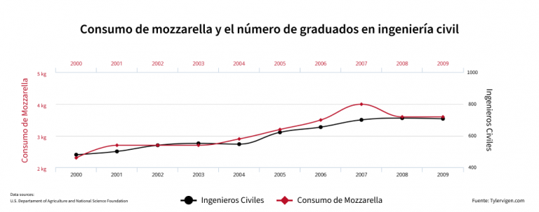 ➡️Ejemplo: Imagina dos variables sin relación alguna como el consumo de Mozzarella y el número de graduados en ingeniería civil. Si dibujamos ambas gráficas a lo largo de los años, podremos ver que aparentemente existe una correlación entre ambas, dando como resultado un aumento de consumo de Mozzarella cuando hay más graduados en ingeniería civil. Sin embargo, es más que evidente que esta correlación es artificial, ya que tratan sobre temas inconexos. Establecer una correlación entre ambas es, por tanto, erróneo.