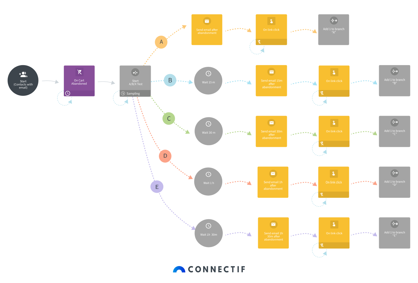 Los tests ABX son un recurso muy potente y sencillo de utilizar para comprobar el tiempo de espera ideal entre el abandono de un carrito y el envío de un email recordatorio con los productos abandonados. Testear varias opciones posibles con una muestra de clientes real nos dará una visión objetiva de cuándo es el mejor momento para impactar a un cliente y recuperar su motivación para la compra. Con Connectif, hacer esa prueba es sencillo. Te mostramos a continuación la estrategia completa, en forma de workflow (flujo de interacción automatizado).