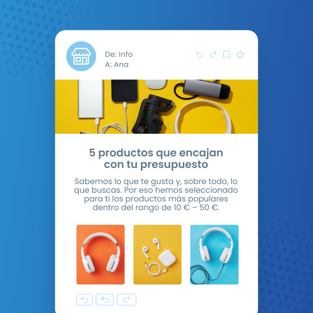Ejemplo: Si un cliente busca productos entre 10 € y 50 €, el sistema selecciona 5 artículos que cumplen el rango y que son tendencia para enviar un email con recomendaciones de producto.
