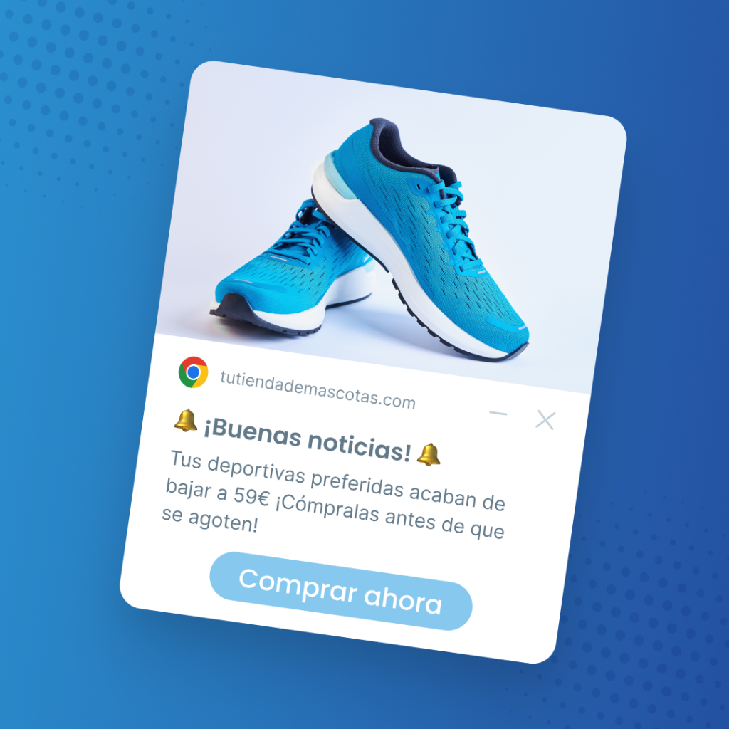 Ejemplo: Un cliente buscó artículos entre 40 € y 60 € y detectamos que un producto de su interés baja de 70 € a 59 €. Se le comunica a través de una notificación push.