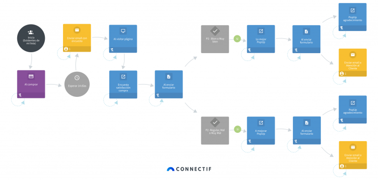 - Tras la compra de un producto este workflow automatiza una espera de 14 días y envía un email con una encuesta preguntando al cliente cómo ha sido su experiencia.