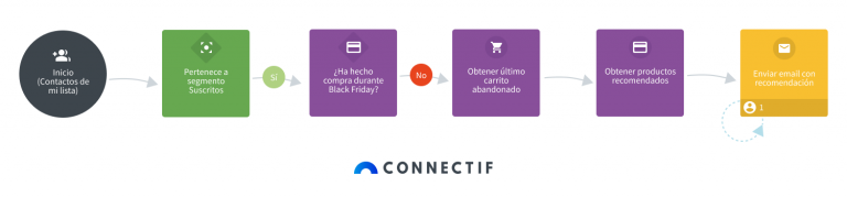 - Este flujo automatizado identifica aquellos clientes que abandonaron algún carrito durante Black Friday, para dirigirles una acción de remarketing muy efectiva.