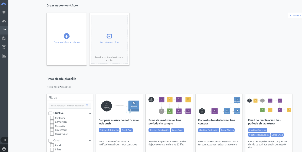 - Encuentra el mejor workflow en marketing digital para ti: Los flujos están divididos en 5 categorias: Adquisición, Conversión, Retención, Fidelización y Reactivación. Seguro que encontrarás lo que mejor encaje en tu estrategia.
