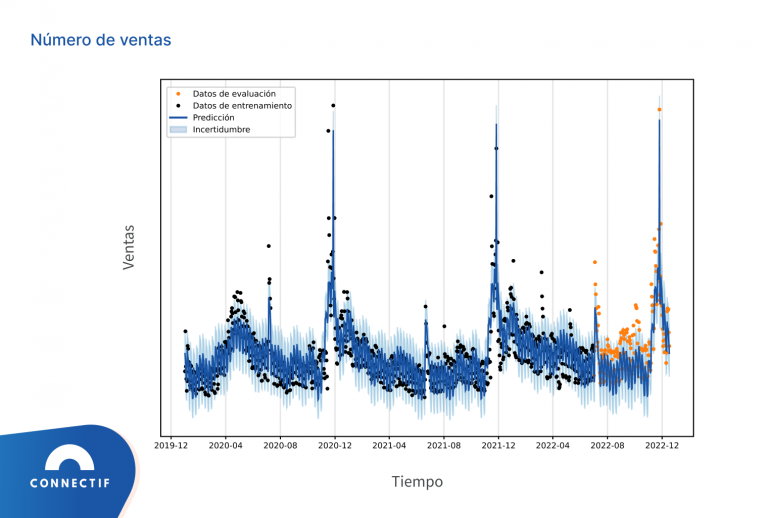 Los puntos negros en este gráfico representan los datos usados para entrenar el modelo, mientras que los naranjas representan los datos utilizados para evaluar el modelo. La línea azúl representa la predicción producida por el modelo una vez entrenado. Por último, el fondo en azúl claro representa la incertidumbre del modelo. En este gráfico, puedes apreciar varias cosas: por un lado, el modelo es capaz de predecir correctamente eventos especiales tales como los picos de Black Friday a finales de noviembre. Por otro lado, es capaz de detectar la estacionalidad presente en los datos, la cual puede apreciarse tanto semanalmente así como anualmente.