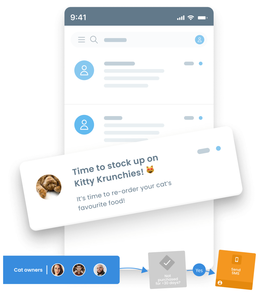 Define el momento ideal para enviar el SMS y conseguir el máximo efecto. Ya sea justo después de una compra, de una suscripción o incluso para reactivar a un cliente que lleva 30 días sin comprar comida para gatos, el límite es el cielo.