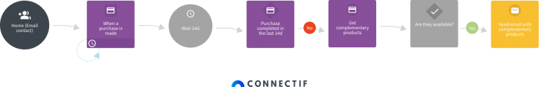When a purchase is registered, the system schedules a 14-day wait in order to detect future orders. If the client doesn’t buy again during that period, this workflow retrieves the latest items purchased by the client and complementary products (if applicable) are assigned. Then, an email with personalized recommendations is sent to the customer to encourage them to shop again.