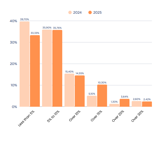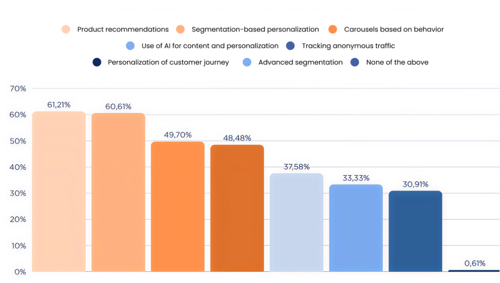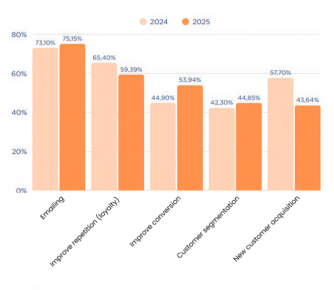 Over the last year, the use of AI in eCommerce has gone far beyond simple content generation. In fact, according to the report, 48% of brands are already using AI for product recommendations and 31% are applying it in advanced audience segmentation. We’ve moved beyond one-off tests: these applications are becoming part of the core of many marketing strategies.