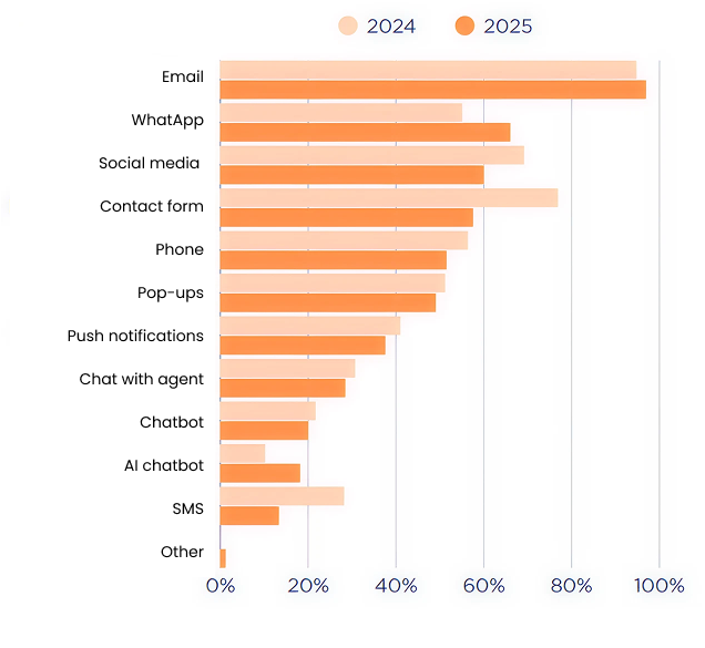 Email leads the way, as usual (96.9%). But WhatsApp is soaring (66%) and other channels such as social networks, forms, phone, pop-up and push notifications continue to occupy the top positions.