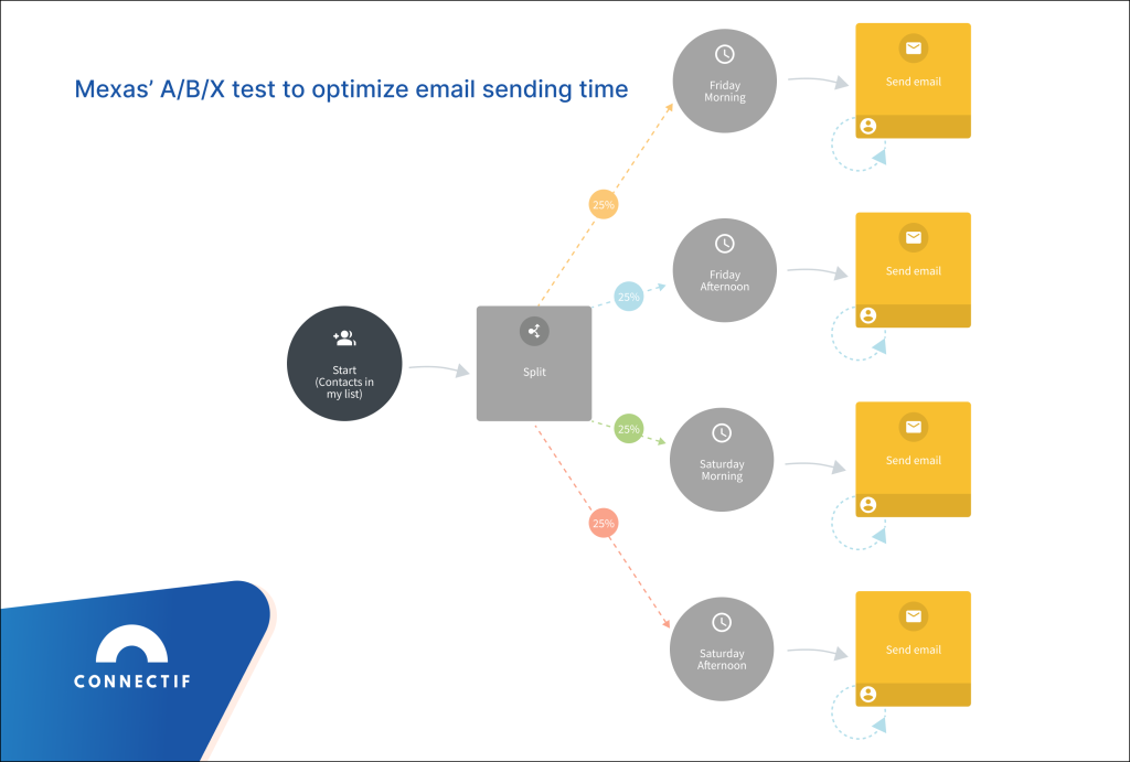 Mexas, the Spanish footwear brand and client of Connectif, made use of the ABX testing functionality in our platform to identify the best sending time to improve the open rate of their newsletters. As you can see in the workflow below, they tested sending their newsletter at four different times: Friday morning, Friday afternoon, Saturday morning and Saturday afternoon.