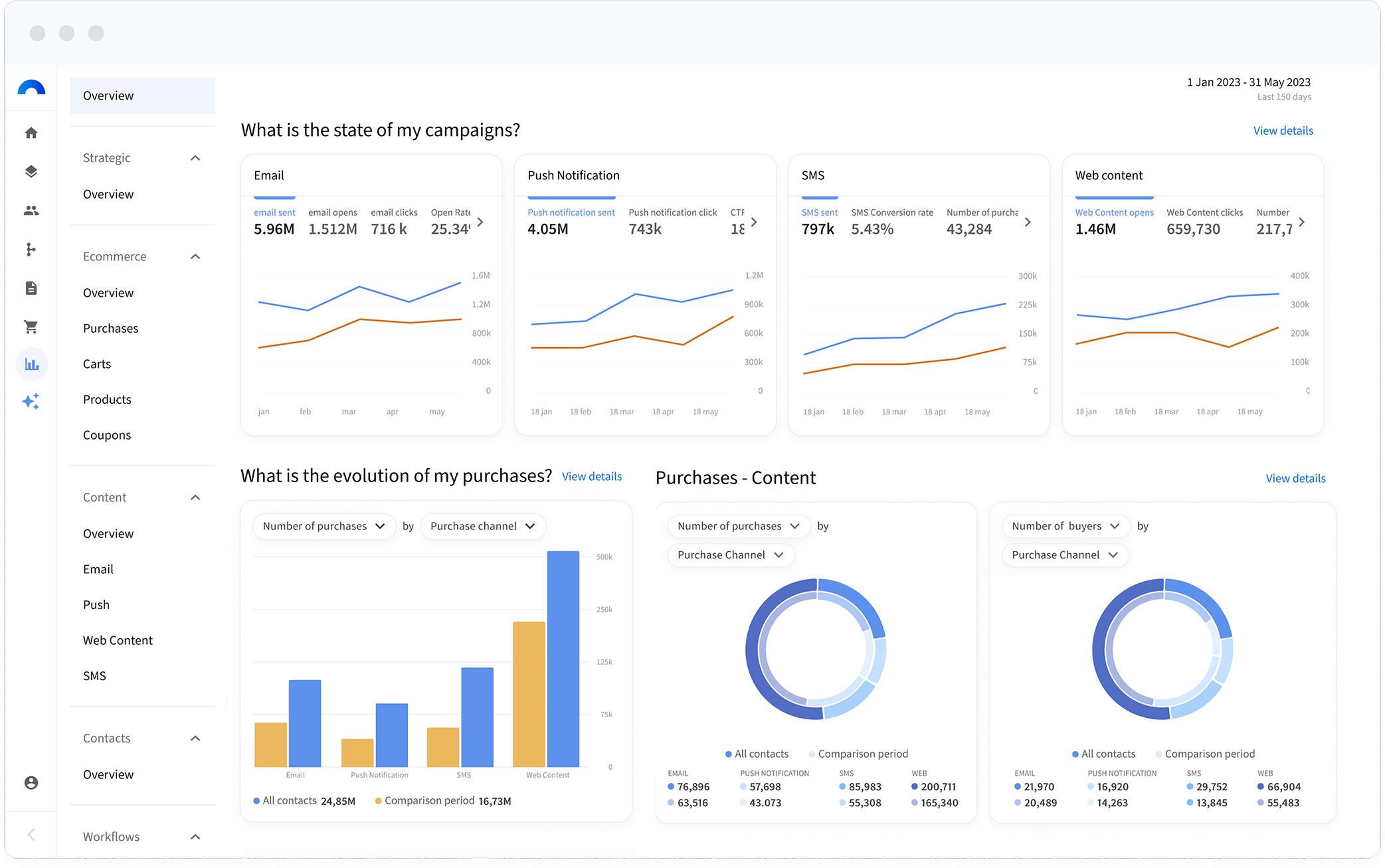 Whether you’re focusing on personalizing messaging, product recommendations or entire experiences, make use of smart dashboards to check, compare and improve the performance of your personalization strategies across all channels.