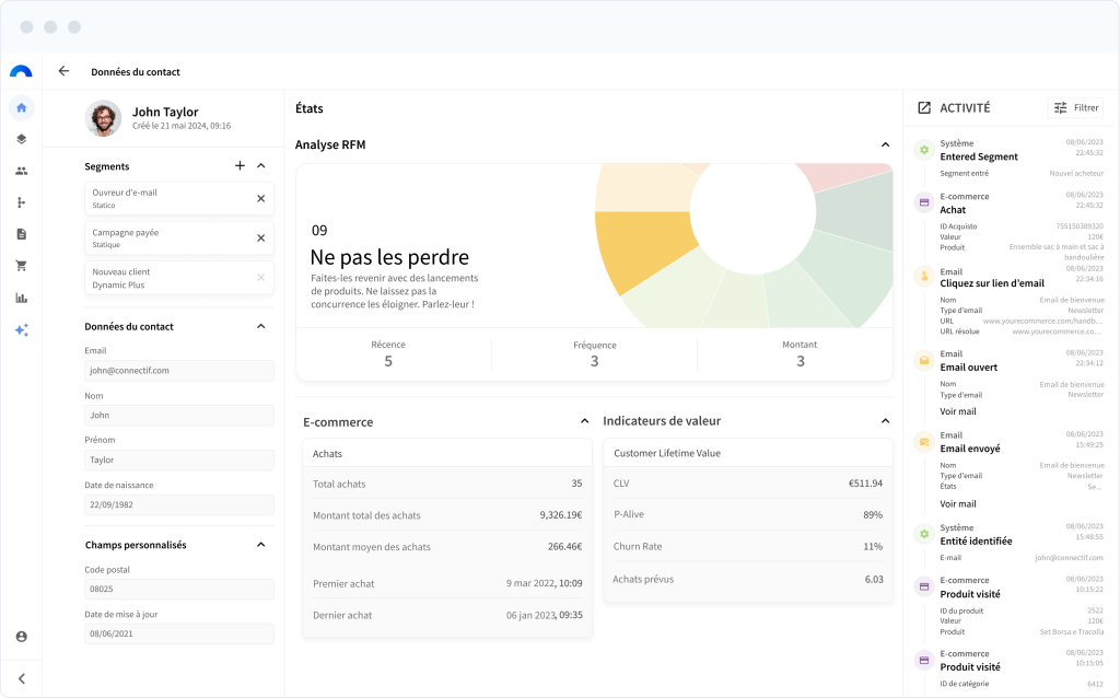 Les données collectées en temps réel permettent d’identifier et d’étudier les comportements, les préférences et les interactions de vos clients, aussi bien dans votre boutique en ligne que sur les autres canaux (e-mails, notifications push, SMS; etc.)
