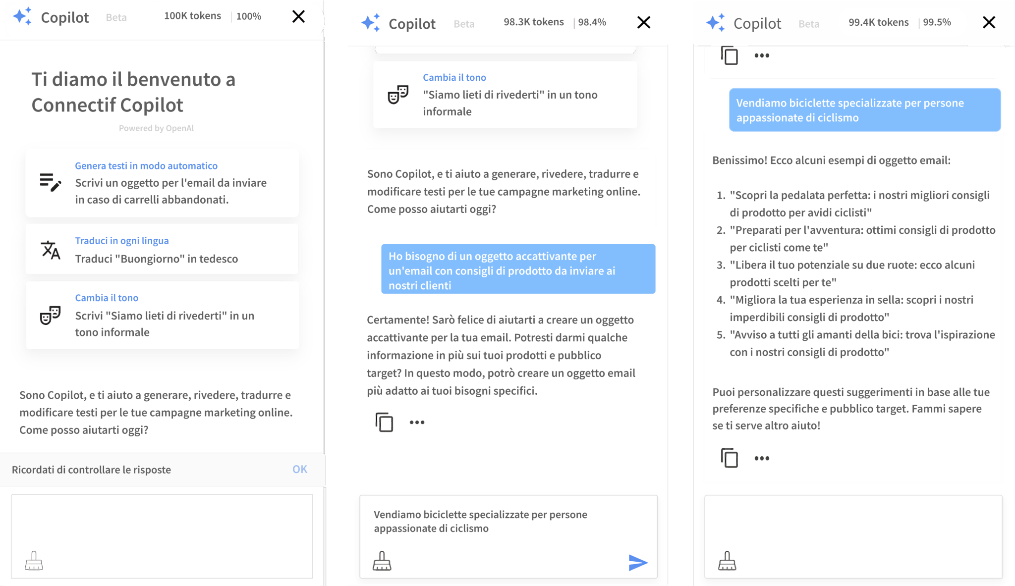 Copilot è il nostro assistente intelligente che può aiutare i marketer a creare contenuti, messaggi personalizzati e traduzioni generate tramite OpenAI, così loro posso risparmiare tempo senza rinunciare a contenuti di qualità.