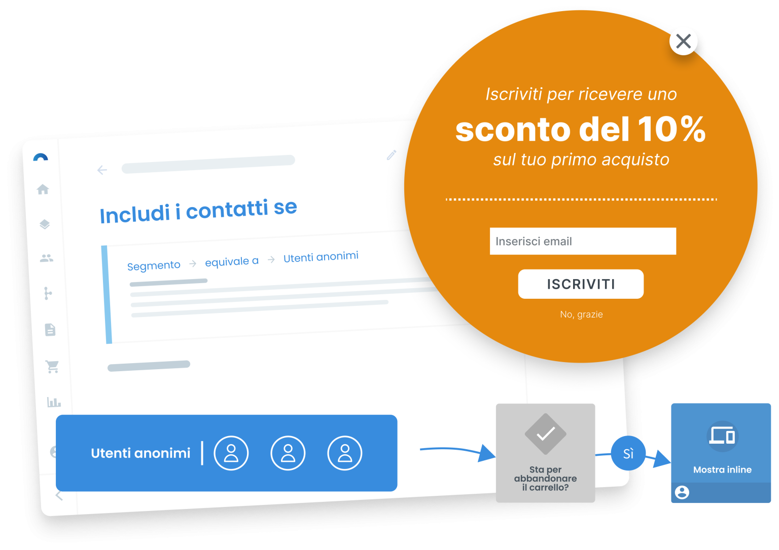 Vuoi raggiungere i clienti anche al di fuori del tuo sito web? Automatizza i contenuti del sito che incoraggiano i visitatori a iscriversi ai tuoi canali e targetizza gli utenti con contenuti personalizzati in base ai dati storici di cui disponi. Individua i tuoi clienti di alto valore e scegli come target pubblici con caratteristiche simili per mantenere una base di iscritti di alta qualità per newsletter, notifiche push e altro ancora.