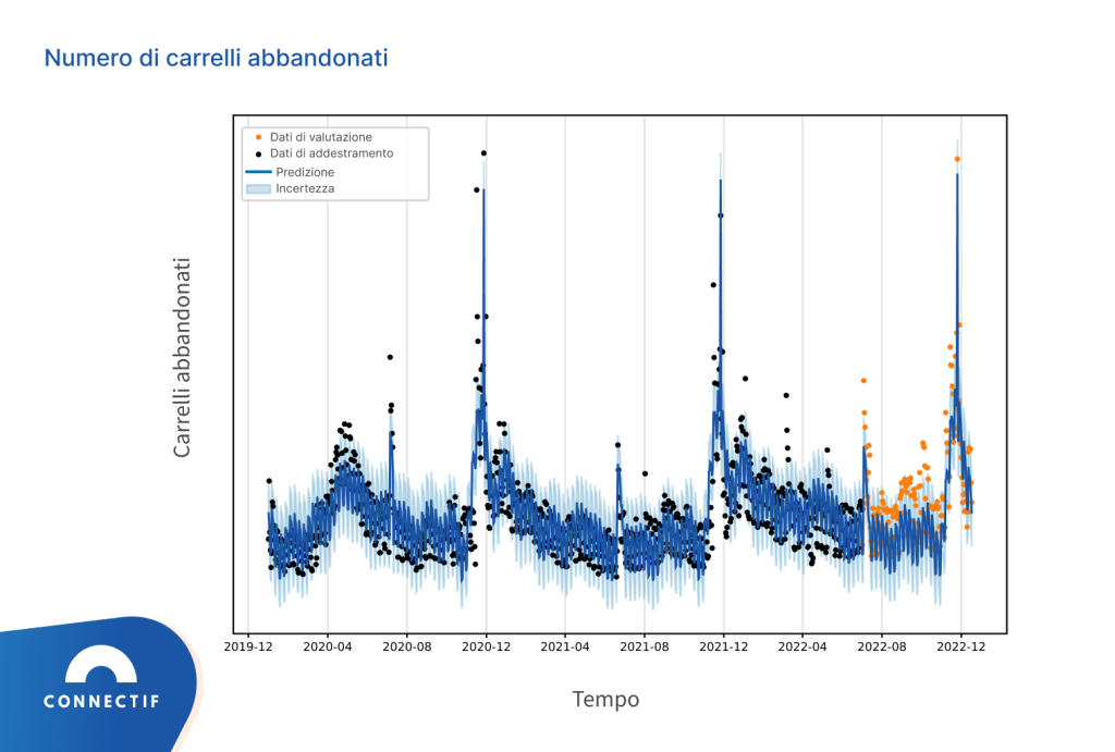 In questo grafico, la legenda è uguale a quella fornita nel grafico precedente. Anche qui, puoi vedere che, con una certa precisione, il modello è in grado di predire il numero di carrelli abbandonati.