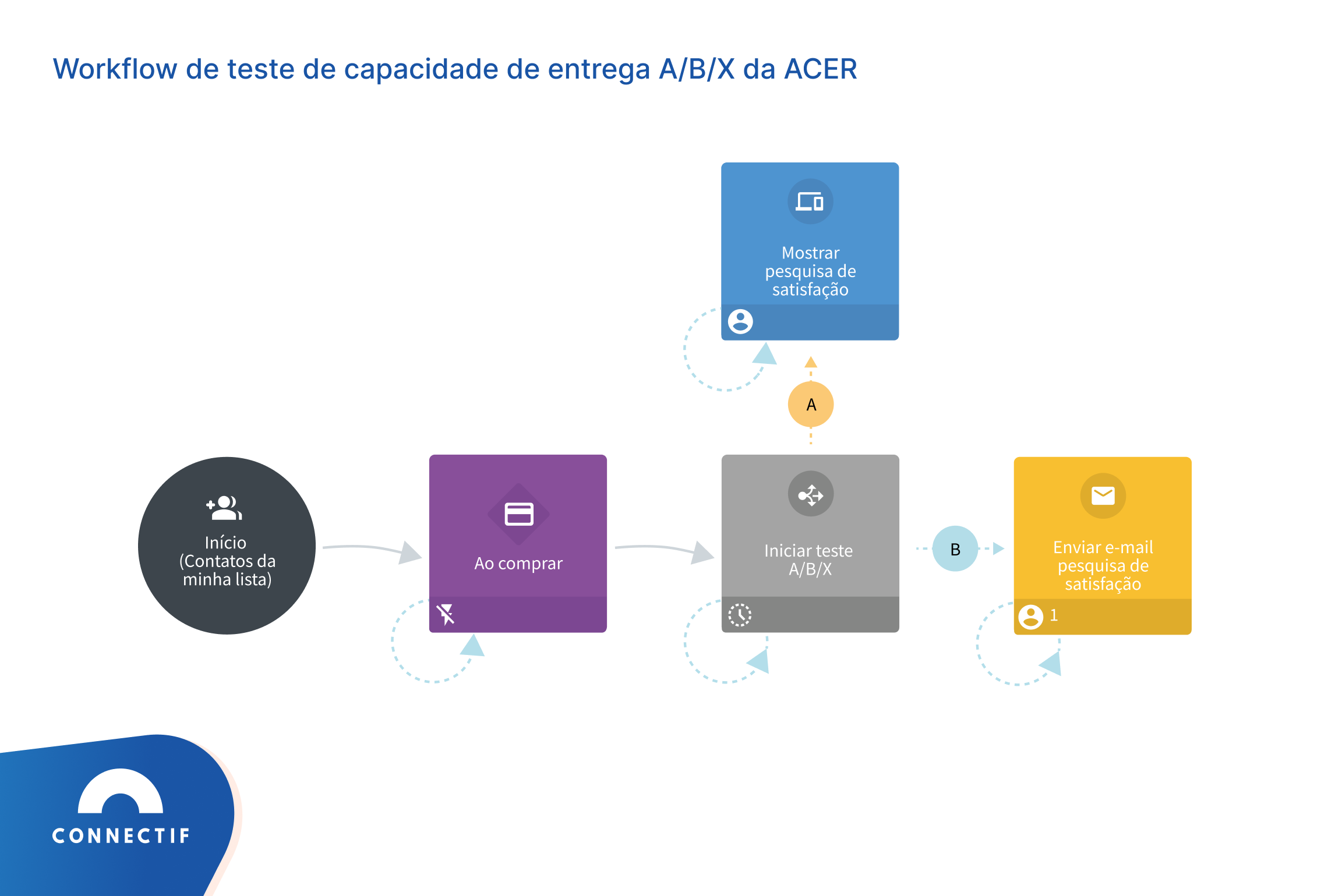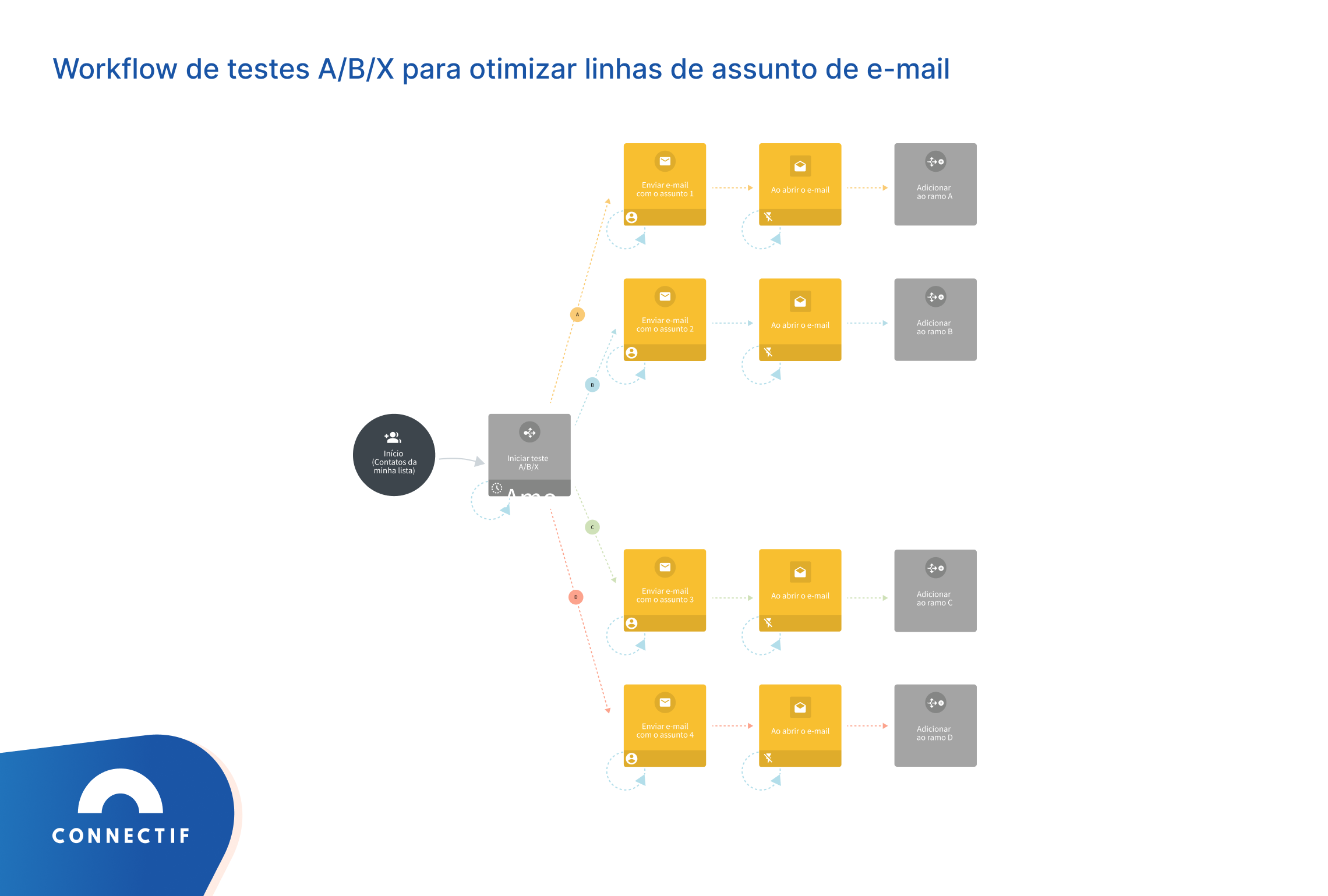 A seguir, você pode ver um exemplo de um modelo de workflow de teste ABX que pode ser facilmente implementado com Connectif para identificar o assunto mais atraente para incentivar os clientes a recuperar carrinhos de compras abandonados.
