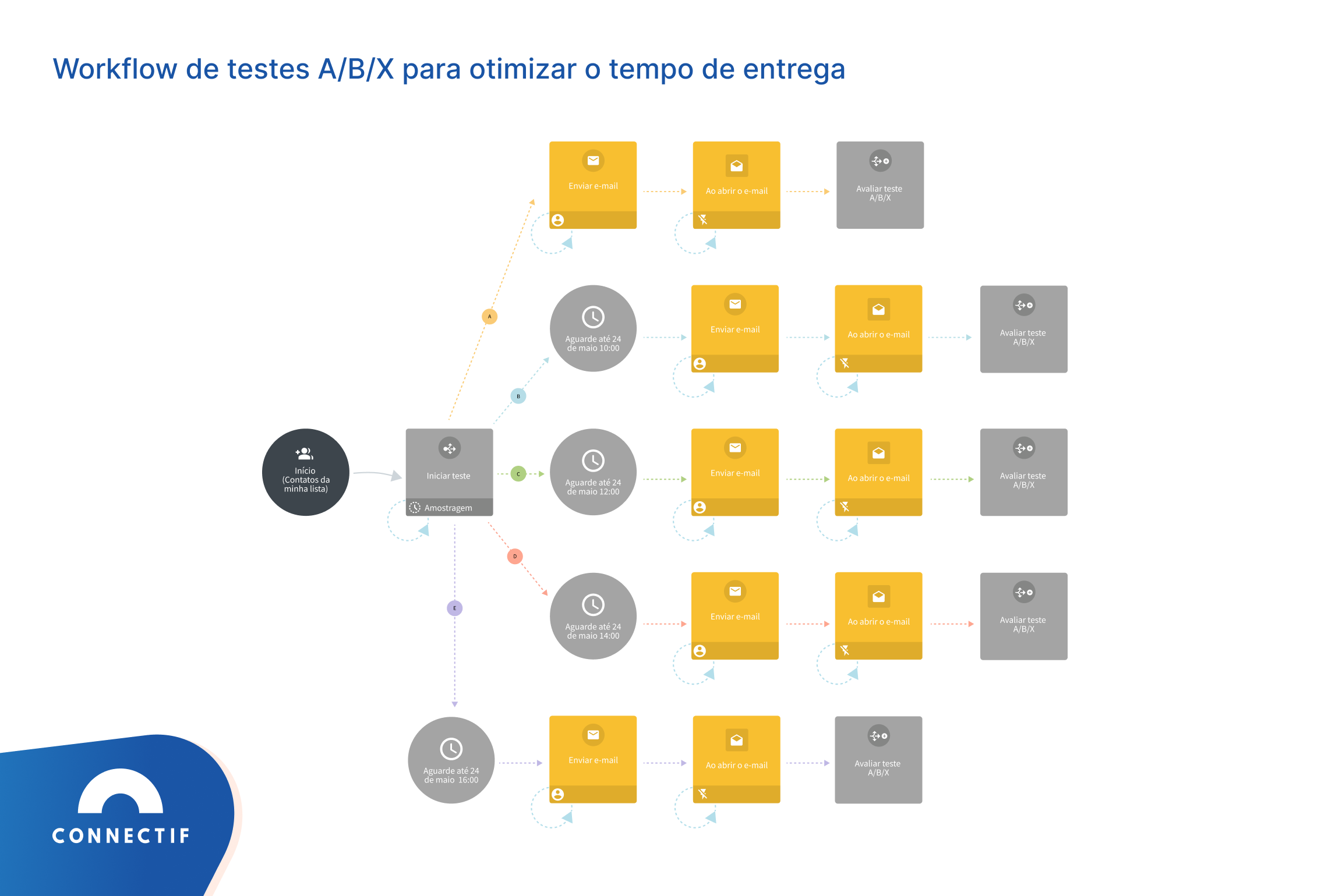 Abaixo, você pode ver um exemplo de um fluxo de trabalho implementado no Connectif para identificar o melhor horário para enviar um e-mail. Como você pode ver, esse teste inclui 5 horários de envio diferentes: imediatamente, 10h, 12h, 14h e 16h.