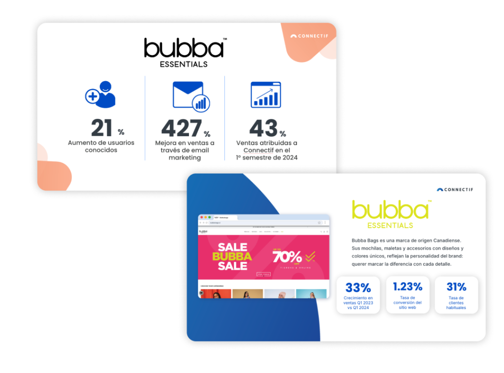 Desde que implementamos Connectif en enero de 2024, hemos obtenido los siguientes resultados: las ventas aumentaron en un 33% entre el primer semestre del año pasado y este, donde 43% de ellas se atribuyen a las acciones implementadas con la plataforma. La base de contactos conocida aumentó en 21% gracias a la estrategia de formularios implementados en el sitio web. Gracias a la comunicación enviada por mail, hemos podido mejorar en 427% las ventas a través de esta fuente de tráfico.